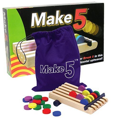 Details: Make 5 from Family Games is an entertaining travel game that comes in its own bag. Use the small wooden discs to make a row of 5, and block your opponent's attempts to do the same thing. Will you Make 5 or Break 5? With 2 levels of play, Make 5 provides lots of fun for 2 players ages 6 and up. It's easy to take this game along on car trips or airplane trips, or just as far as the coffee table. From Family Games America, provider of fun games, puzzles and kits for the whole family.