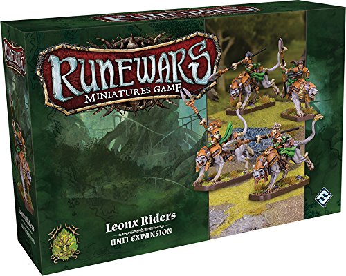 None exemplify the primal, wild nature of the Verdelam more than the Leonx Riders. Charging into battle atop the their ferocious Leonx, large felines native to the Aymhelin, these Elven warriors pierce through enemy lines with the force of a storm, only to use their lightning speed to evade counter-blows and change their angle of attack with the swiftness of a gale. The Leonx Riders Unit Expansion for Runewars Miniatures Game comes with four Leonx Riders figures, two plastic cavalry movement trays, and five upgrade cards to enhance your Latari Elves forces!