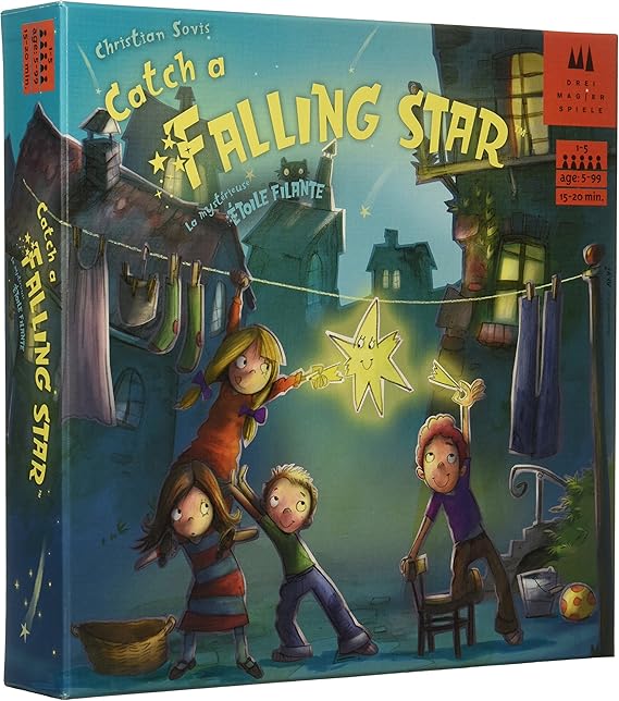 "Catch a Falling Star" Magnetic Balancing Family Board Game - A New Twist on Pick up Sticks Meets Jenga: "What was that" . . . a bright gleam crosses the night sky and disappears into the dark backyard with a quiet "plop." A mysterious shooting star has fallen to earth and is stuck on the clothes line! Now players can try to give back the rays to the little star as carefully as possible, without letting any pieces fall down. Some rays will stick to the star, while others will not. Will you be the first to give all of your rays back to the star You'll need skill and luck to Catch a Falling StarTM and help it be complete again! For 1 to 5 Players, 20 Minute Playing Time, Ages 5 to Adult Contents: Gameboard, a Star with 3 Magnets, a Clothes Line, 2 Wooden Poles, 12 Star Rays with Metal Rings, 20 Star Rays without Metal Rings and Instructions in English, Spanish and French